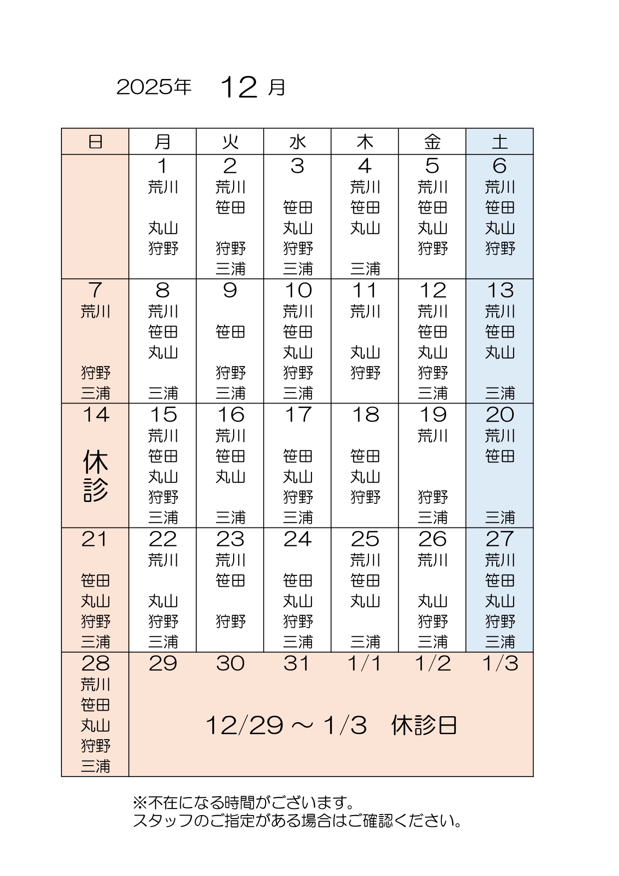 12月の休診日は14日(日)、29~31日(月~水)、です。