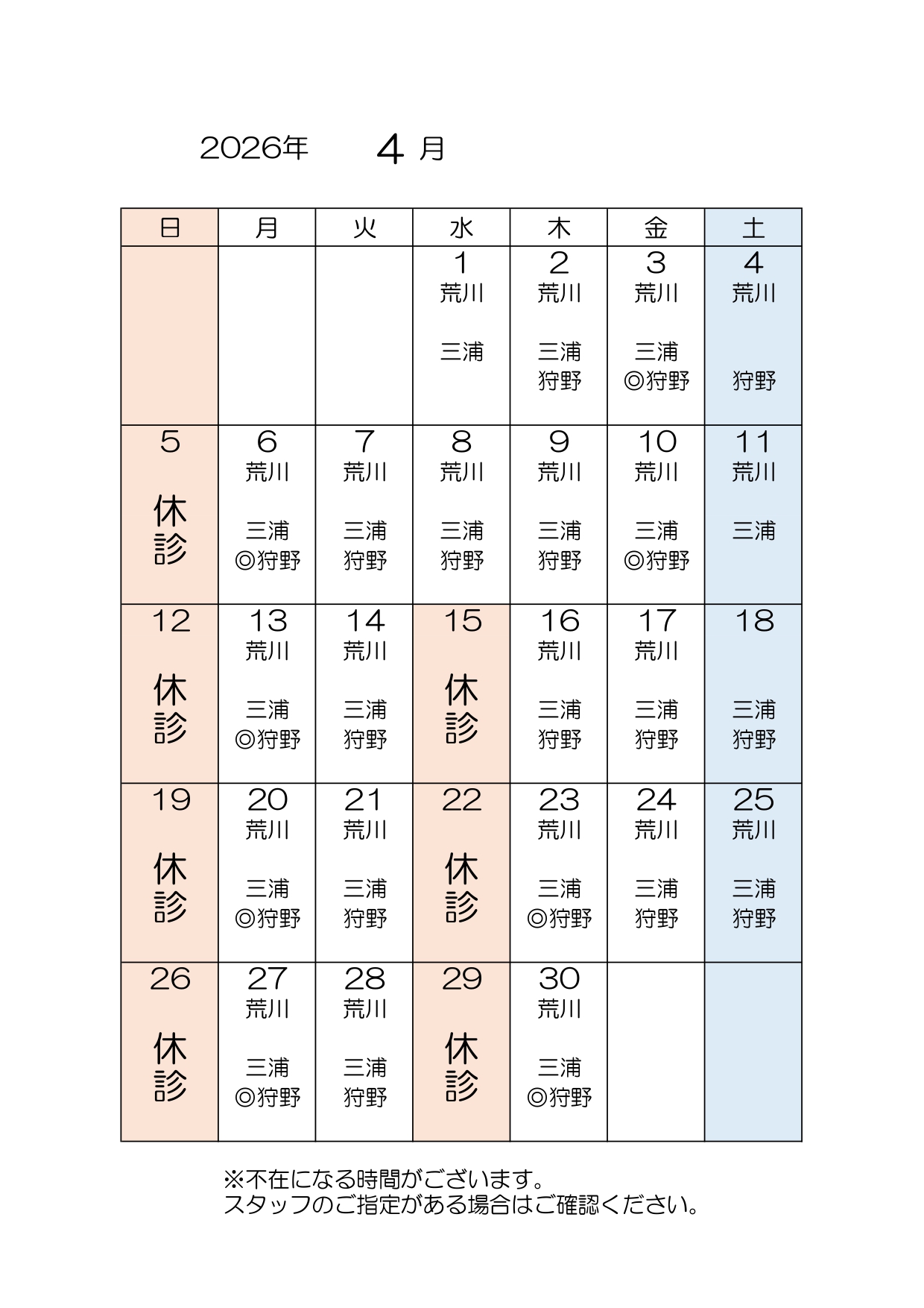 2026年4月の診療のご案内